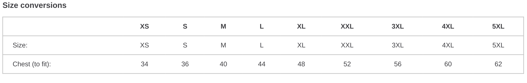 | Chest (to fit) | 34 | 36 | 40 | 44 | 48 | 52 | 56 | 60 | 62 |