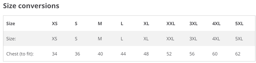 | Chest (to fit) | 34 | 36 | 40 | 44 | 48 | 52 | 56 | 60 | 62 |